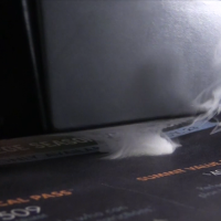 The heat from a camera flash makes a puff of smoke from a black surface.