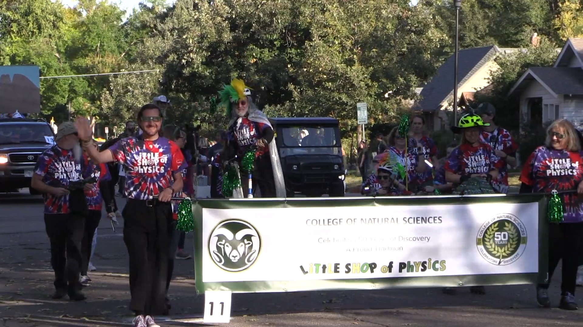 For the first time the Little Shop of Physics “marched” in the annual Colorado State University Homecoming Parade. We handed out rainbow glasses to folks along the parade route, and had all sorts of bright shiny things to look at. We also had some of our signature human powered vehicles!